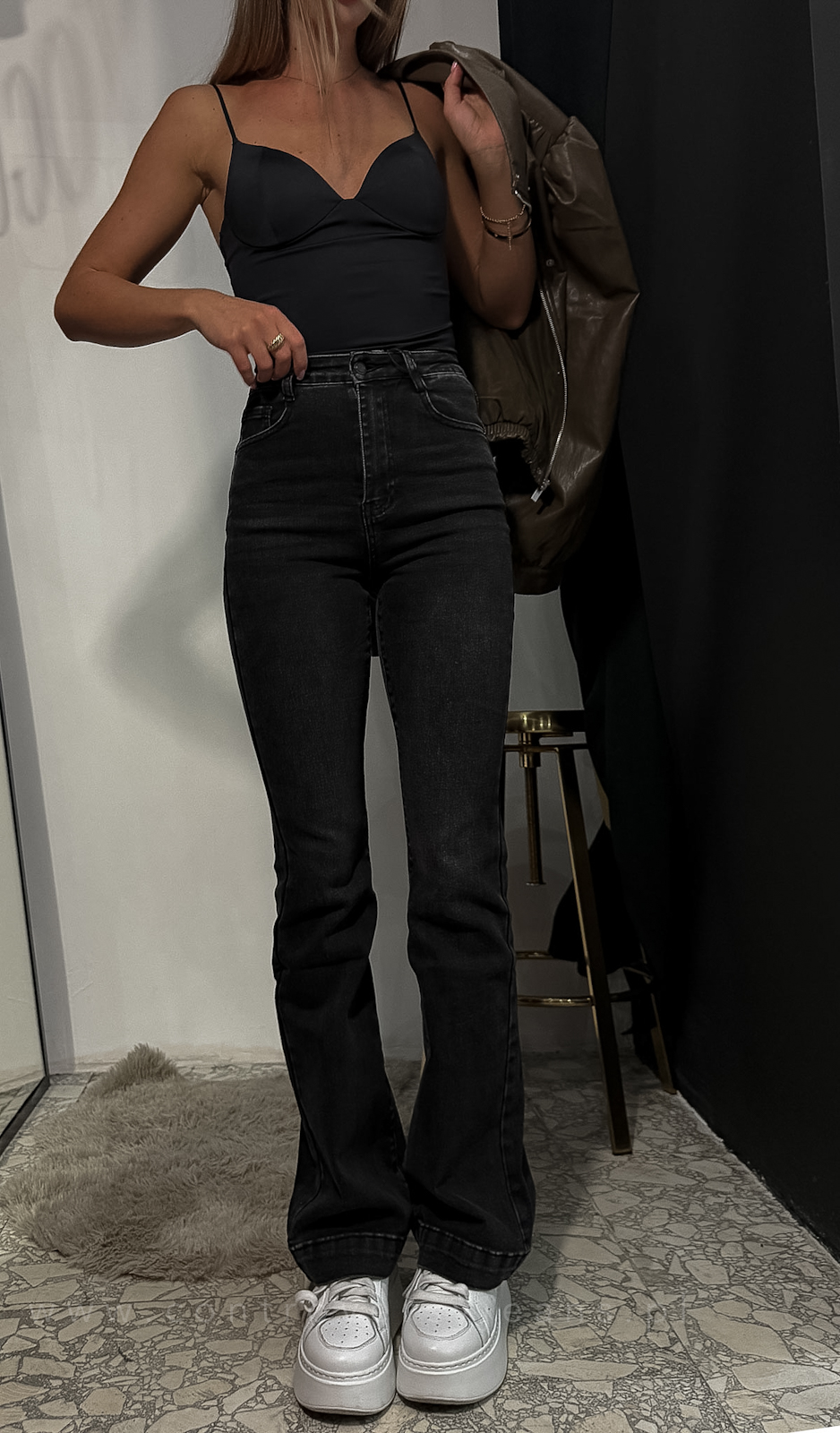 Ciemnoszare jeansy flare – elastyczne, z wysokim stanem, wygodne i kobiece