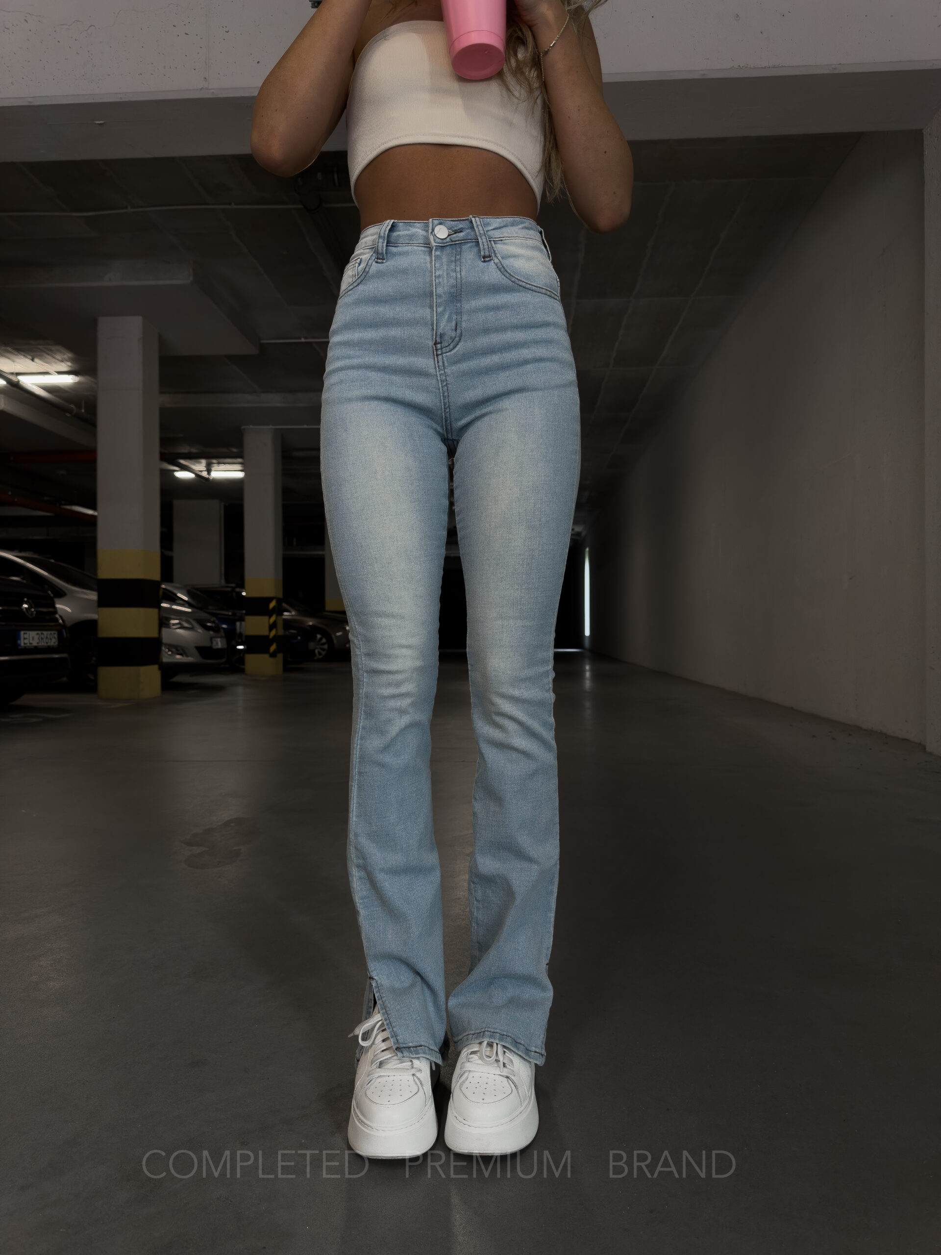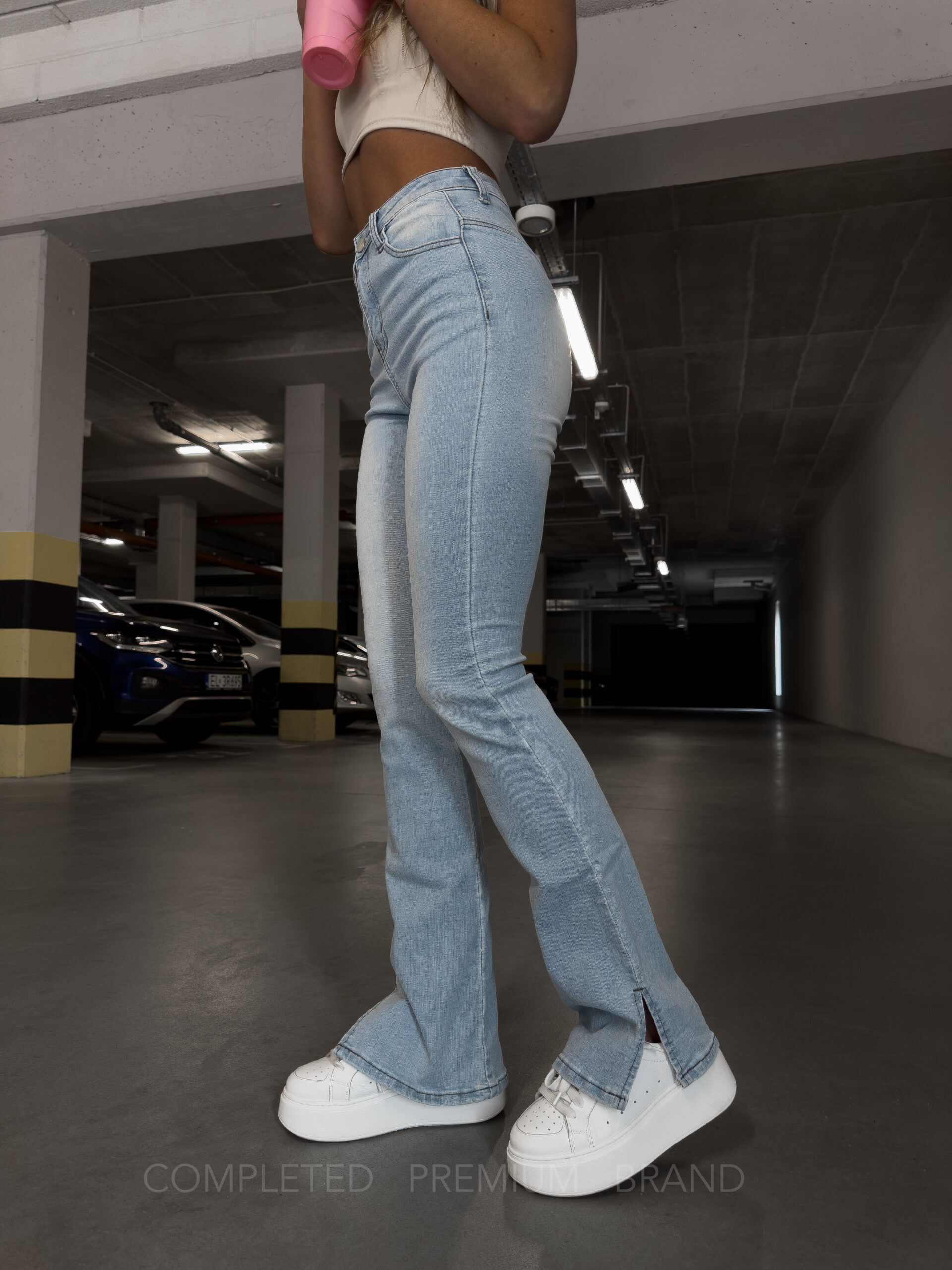 Jeansy z akcentem modelującym optycznie pośladki. Klasyczny krój i wysoki stan. Rozcięcie na nogawce .