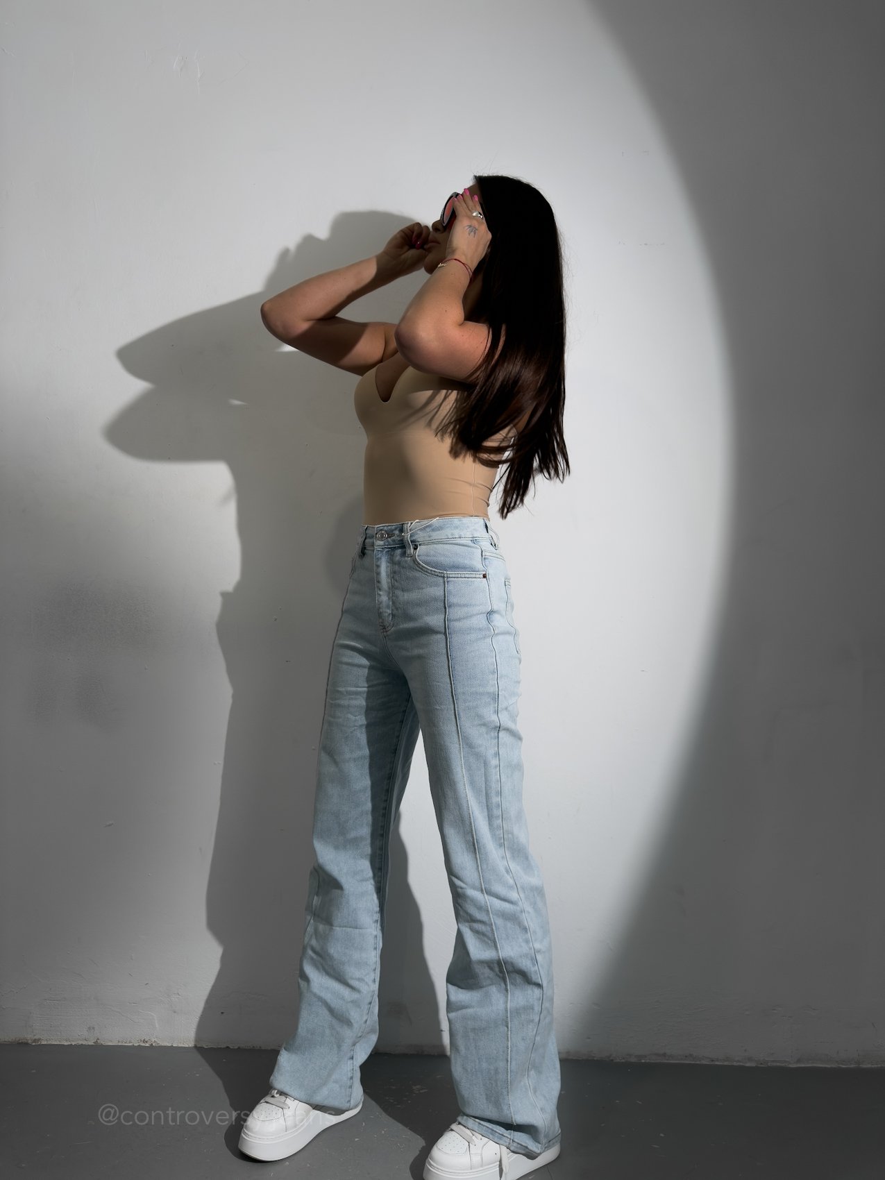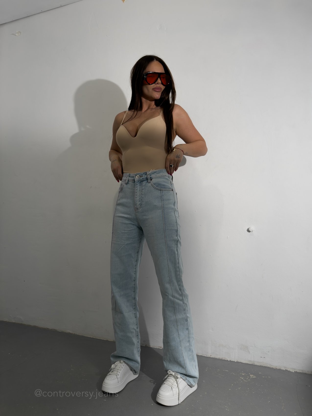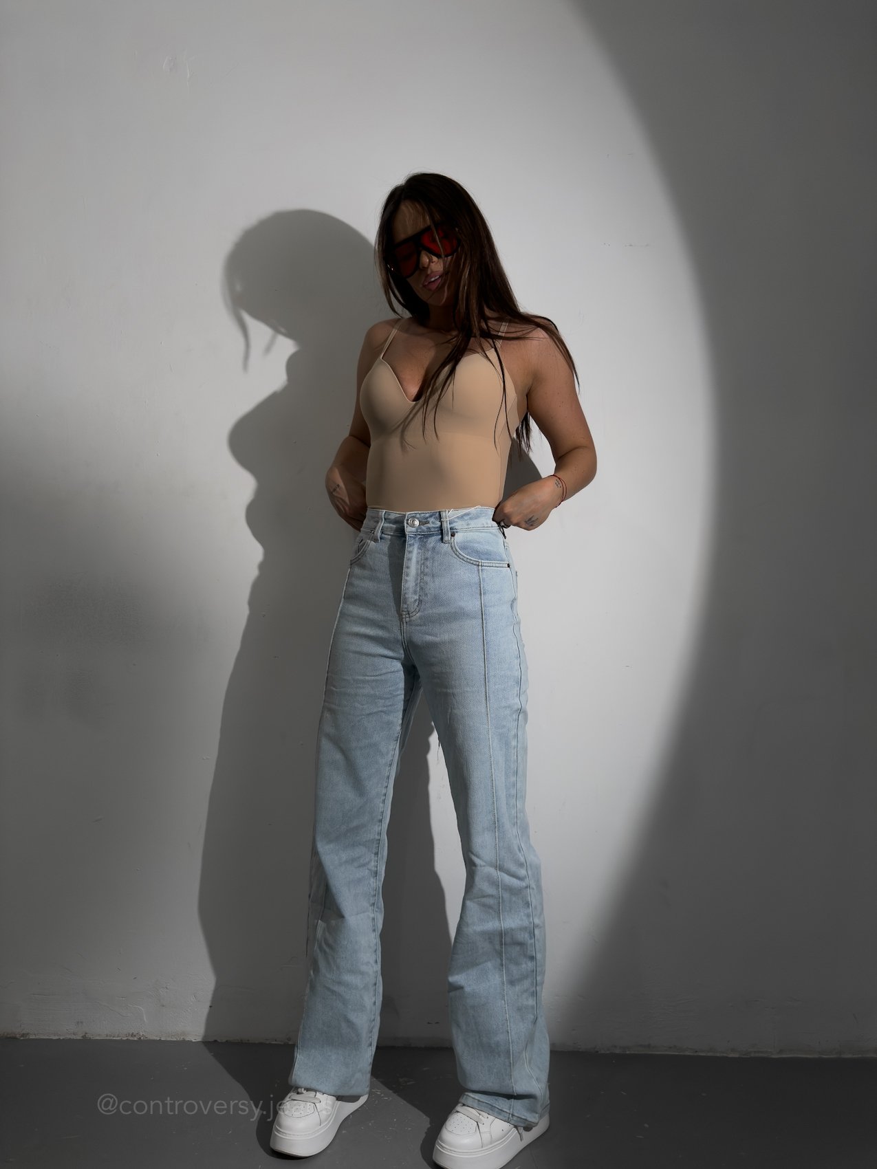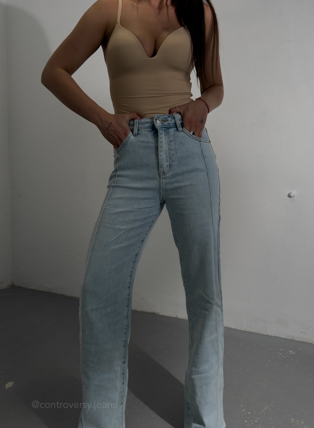 Jasnoniebieskie jeansy flare z przeszyciem z przodu – unikatowy styl i komfort na cały dzień