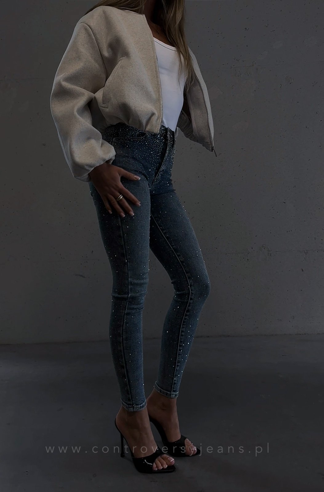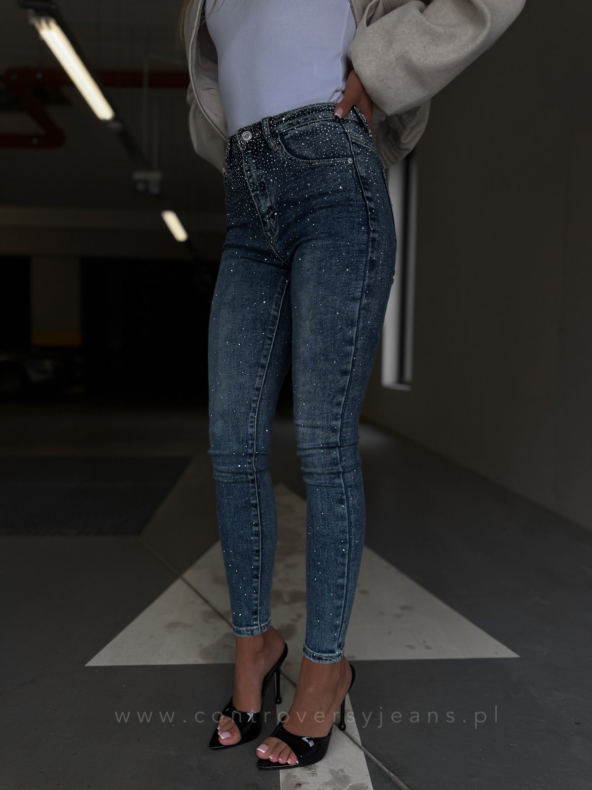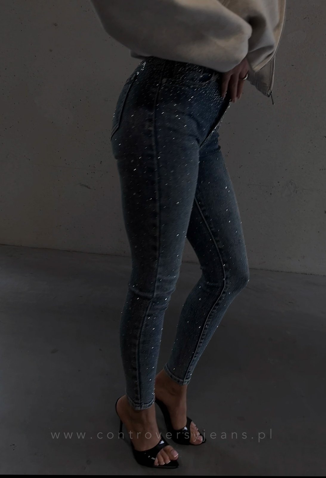 Elastyczne spodnie jeansowe damskie skinny z diamencikami to połączenie nowoczesnego stylu, wygody i kobiecej elegancji. Wykonane z wysokiej jakości, rozciągliwego denimu, idealnie dopasowują się do sylwetki, modelując nogi i podkreślając kształty. Dzięki wysokiemu stanowi spodnie doskonale trzymają się na talii, nadając figurze smukłości i pięknie akcentując proporcje.