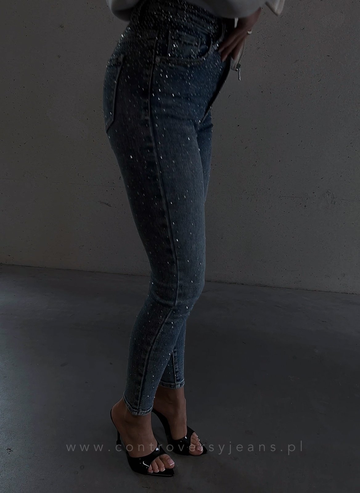 Największym atutem tego modelu są subtelne diamenciki rozmieszczone na tkaninie, które dodają całości niepowtarzalnego blasku. To właśnie one sprawiają, że jeansy wyróżniają się spośród klasycznych modeli i stają się wyjątkowym elementem garderoby. Spodnie świetnie sprawdzą się zarówno w stylizacjach codziennych, jak i wieczorowych – wystarczy zestawić je z prostym topem, marynarką lub elegancką bluzką, by stworzyć modny i kobiecy look.
